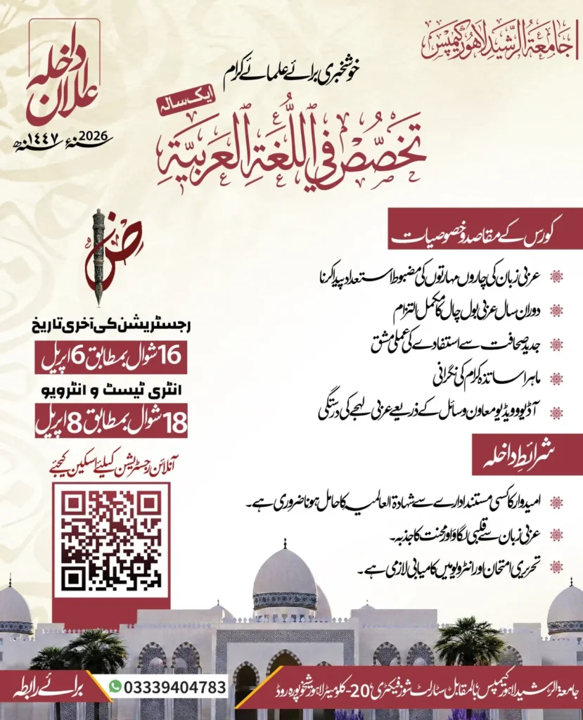 - دورانِ سال مکمل عربی بول چال کا لازمی التزام۔