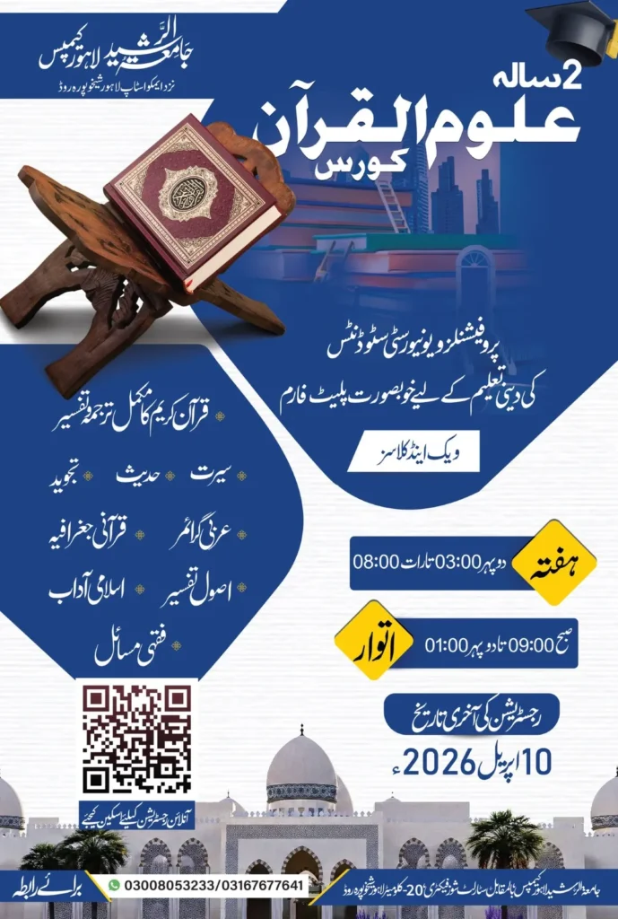 یہ کورس خاص طور پر یونیورسٹی اسٹوڈنٹس اور مختلف شعبہ ہائے زندگی سے تعلق رکھنے والے پروفیشنلز کے لیے ڈیزائن کیا گیا ہے جو اپنی مصروفیات کے ساتھ ساتھ مستند دینی تعلیم حاصل کرنا چاہتے ہیں۔