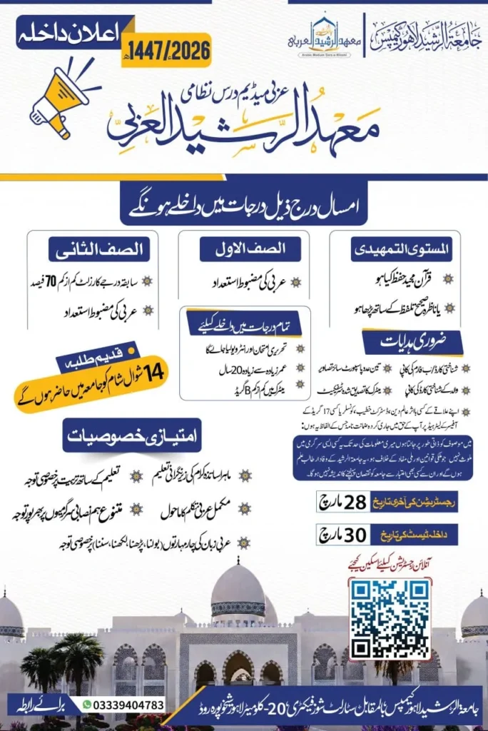 درس نظامی کے ابتدائی درجات (المستویٰ التمہیدی، الصف الاول، الصف الثانی) کی مکمل عربی میڈیم میں تعلیم۔